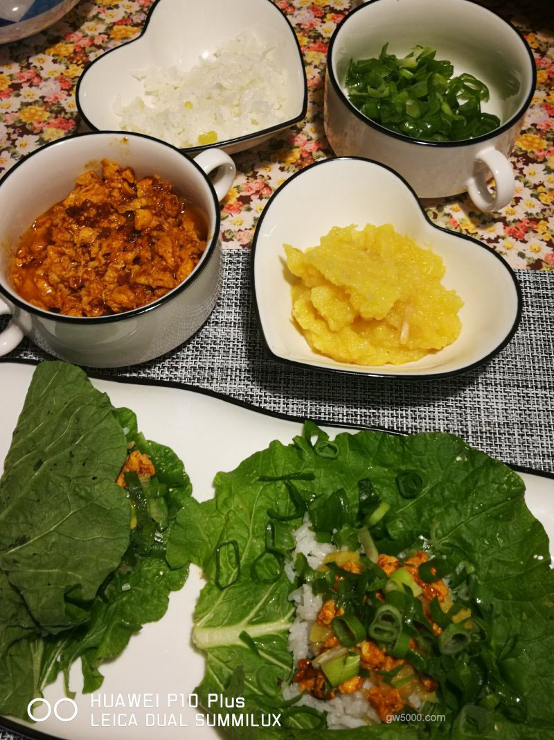 如果是自己在家吃,那就不要装淑女了,把所有食材在大碗里拌匀,舀一勺放白菜叶上,赶紧塞到嘴里,米饭香、土豆香、葱香、酱香的混合味道冲击口腔,太美味了!