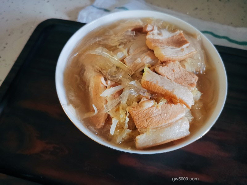 2.炖酸菜讲究的就是软烂才能入味,五花肉香而不腻,要小火慢炖一个半到二个小时,水要多放,酸菜汤非常好喝,粉条不用泡。