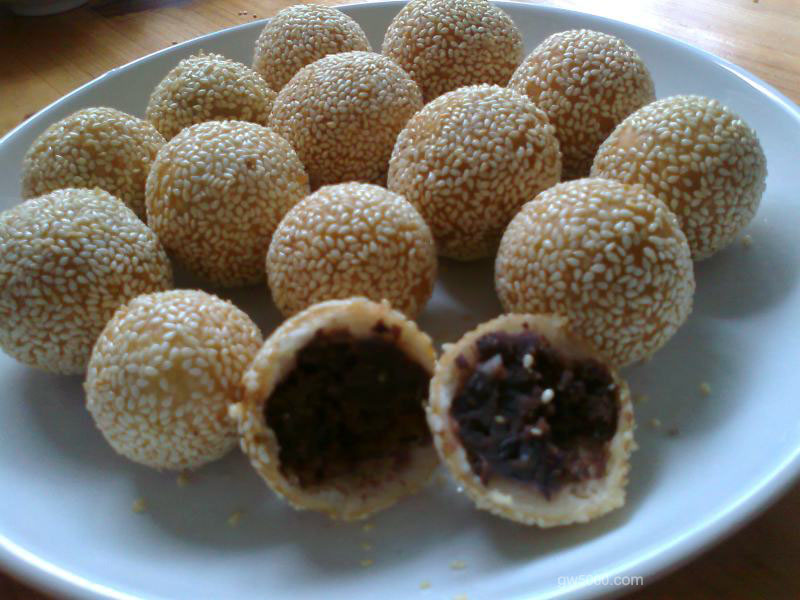 1主要材料:糯米粉250克,面粉150克,粳米粉100克,自制豆沙陷,芝麻适量