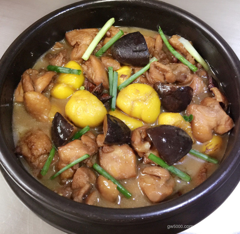 11先加入板栗烧至一会,再加入香菇,加入适量的开水,两勺左右的老抽,再加适量的糖,盐,用量按个人口味增减,待水烧开,改小火进行焖煮至熟透。