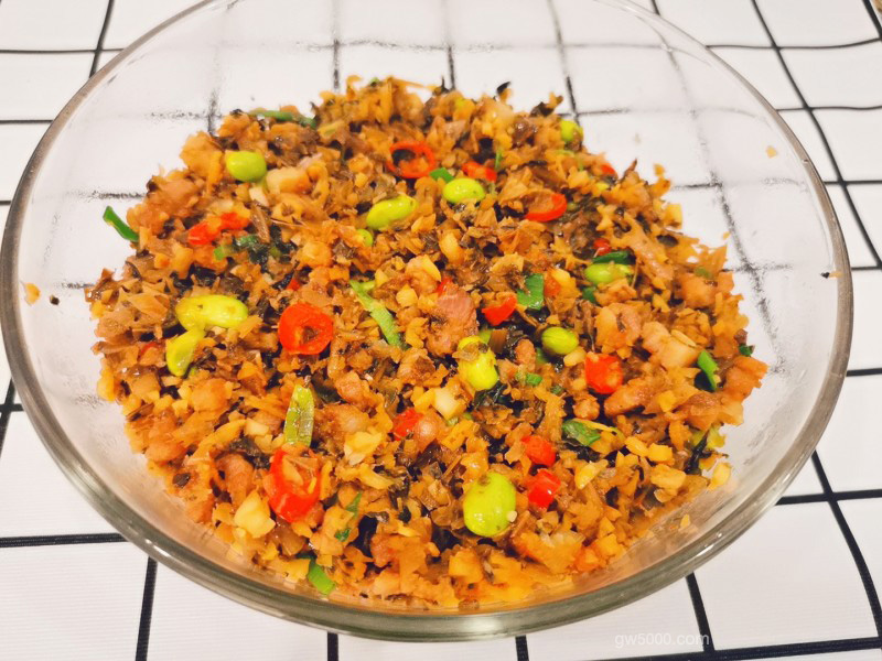 加梅干菜翻炒均匀尝一下咸淡加少量盐。