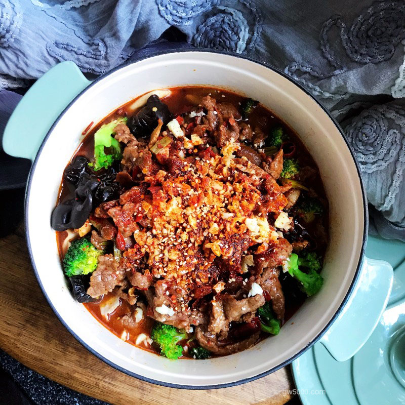 - 11西兰花焯水放入锅中,牛肉变色带汤一起倒入锅中。