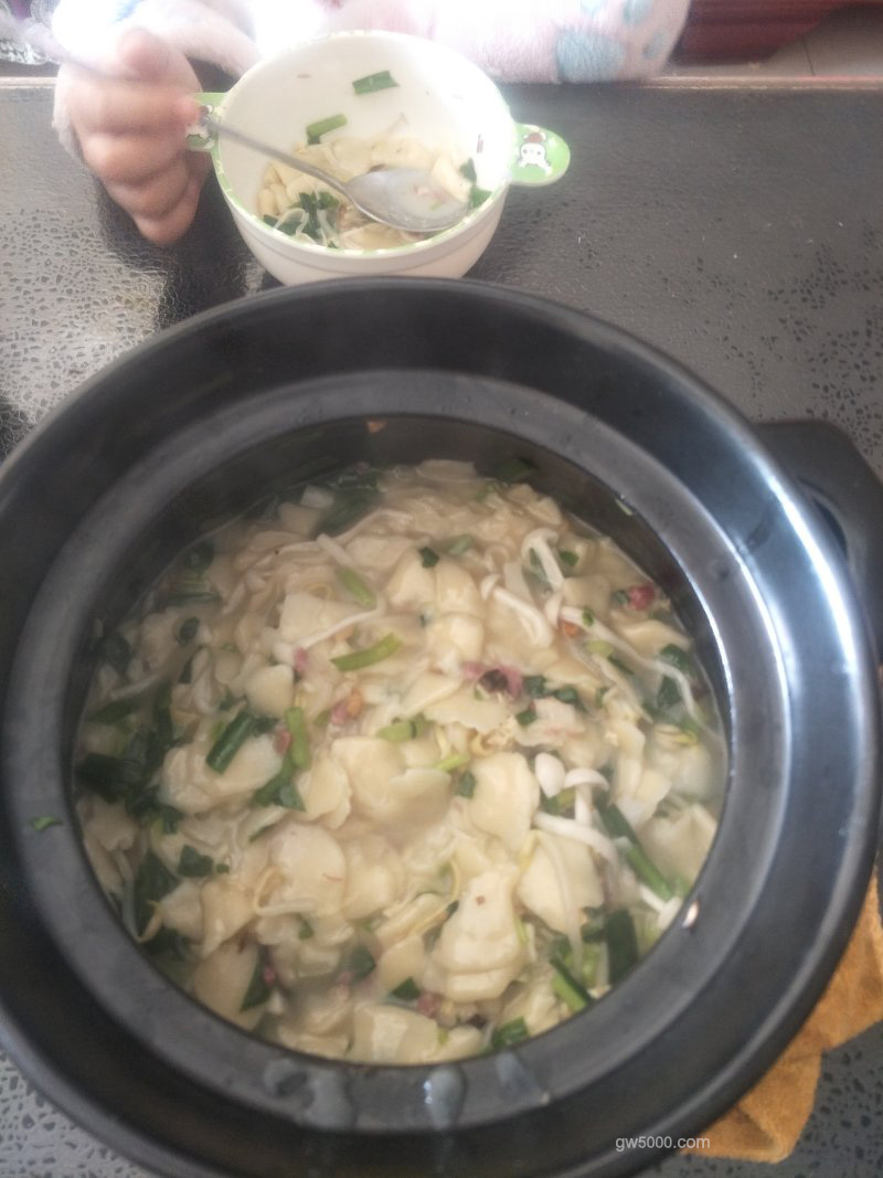 - 12蒜末跟汤倒入砂锅里。