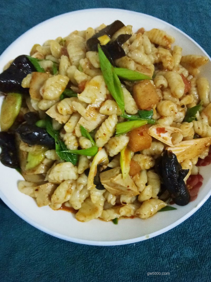 - 9放入煮好的猫耳朵,加老抽,鸡精,味精翻炒