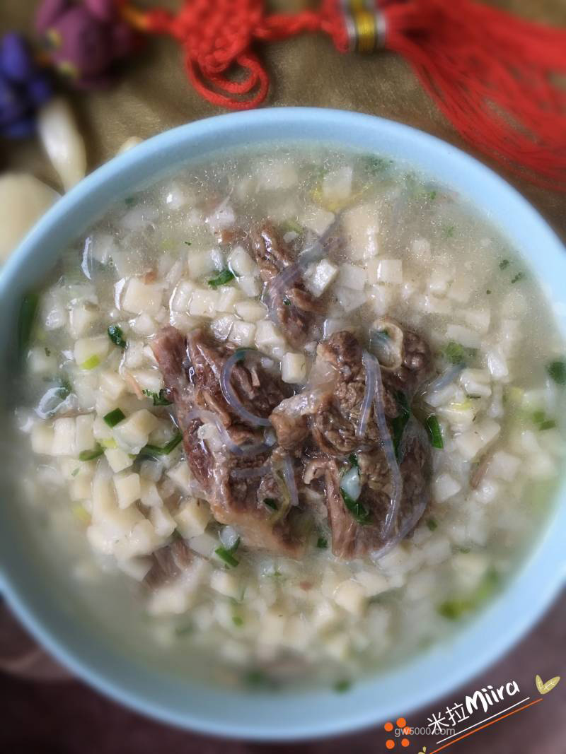 将肉汤和适量清水一起煮开,加碎馍块和粉丝,香菜青蒜苗,放入肉块一同煮开,加盐调味