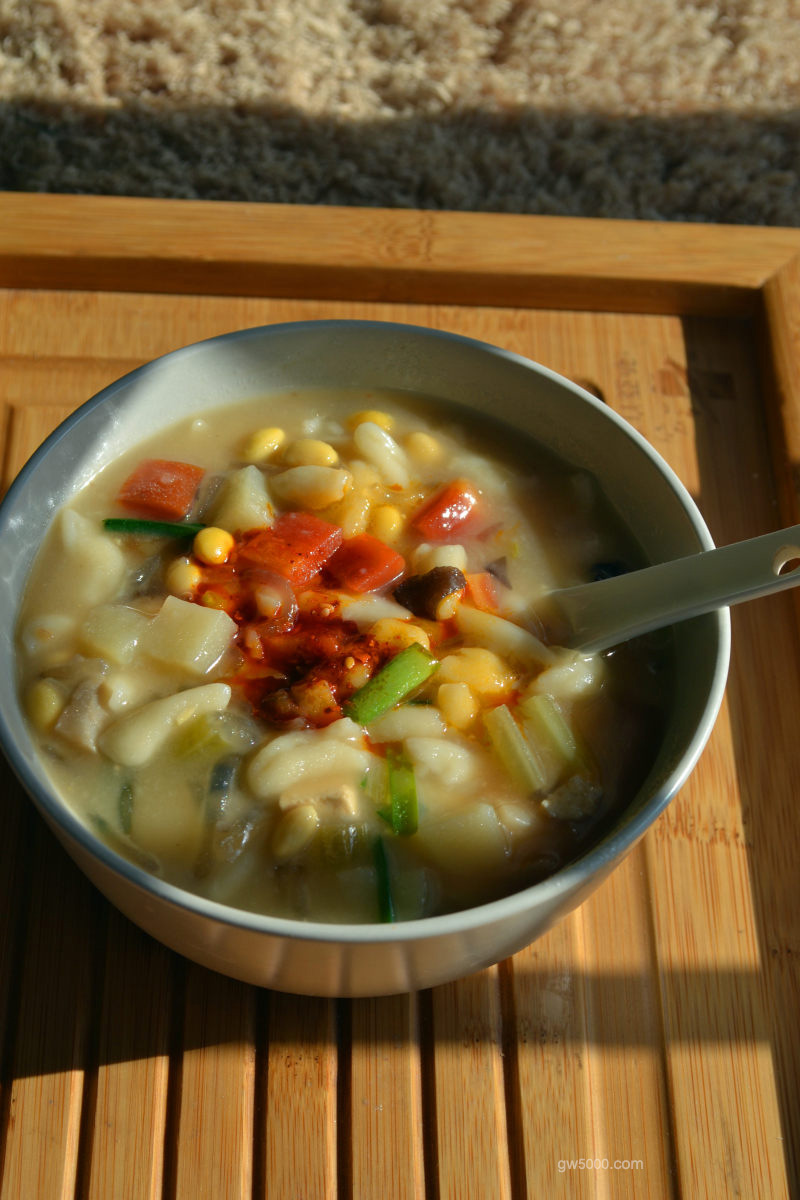 - 15煮锅入水烧开,下麻食煮熟后放入炒好的烩菜,稍煮调味