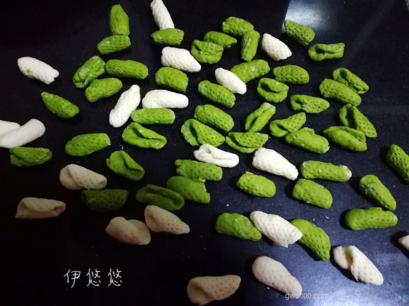 - 11如果不是立即吃,就放冰箱冷冻保存。可以多做些放冰箱,随吃随拿。这是刚从冰箱拿出来的双色麻食。