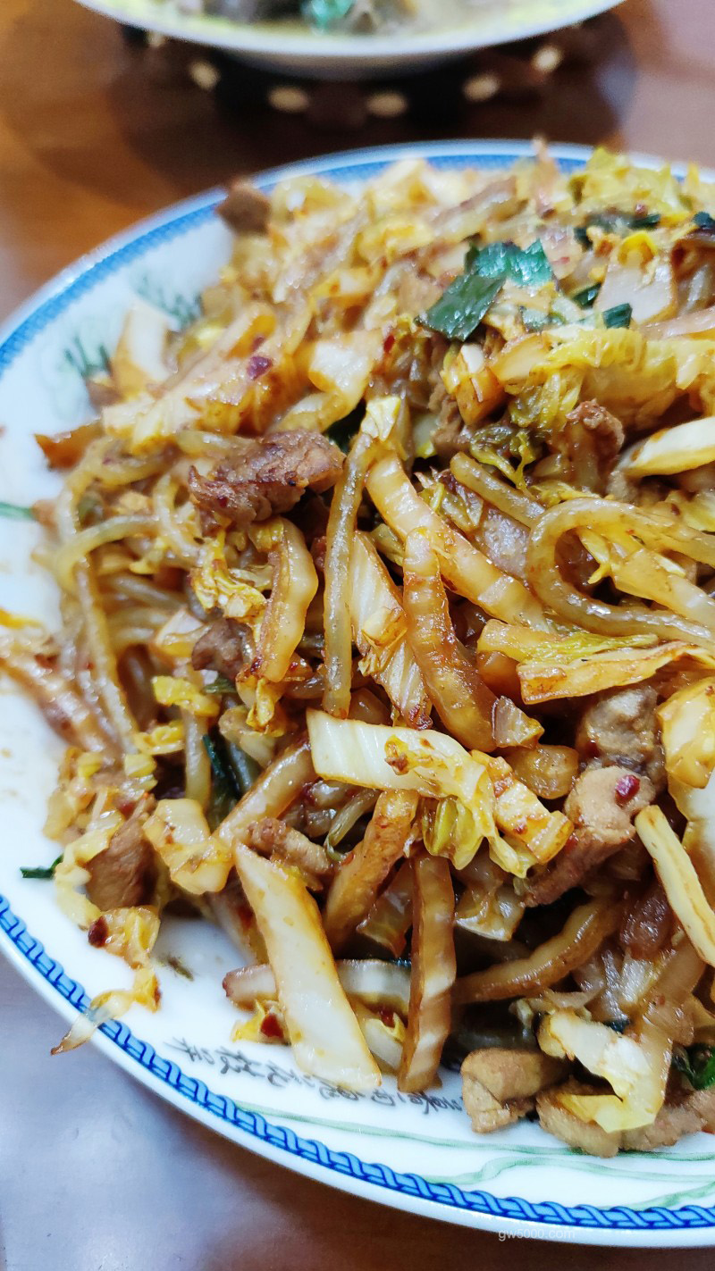 再倒入酸菜翻炒,稍炒一会放入粉条,加辣椒段,胡椒粉,盐,老抽提色,加少许水焖至水干即可。