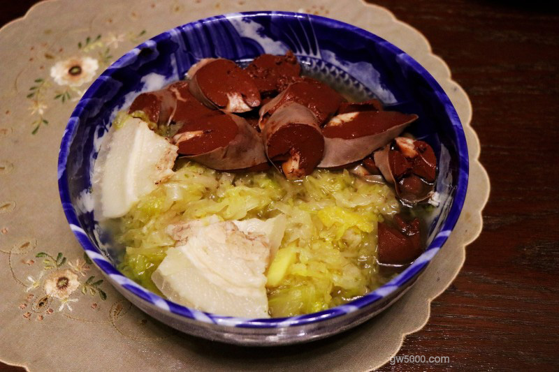 五花肉和酸菜放入锅里加适当水,大火烧开转小火30分钟,五花肉捞出切片。然后和血肠一起放入锅里煮几分钟加盐即可。大蒜剁碎加生抽做蒜酱,五花肉沾蒜酱吃。