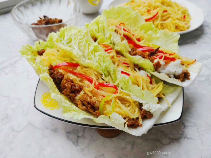 - 9先取一片白菜叶,抹上适量的鸡蛋酱,再放入白白的大米饭,最后来一些炒好的尖椒土豆丝,一个包饭就做好。