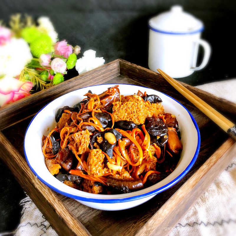 - 6锅里留少许油,加入香菇、虫草花、黑木耳和花生米一同煸炒
