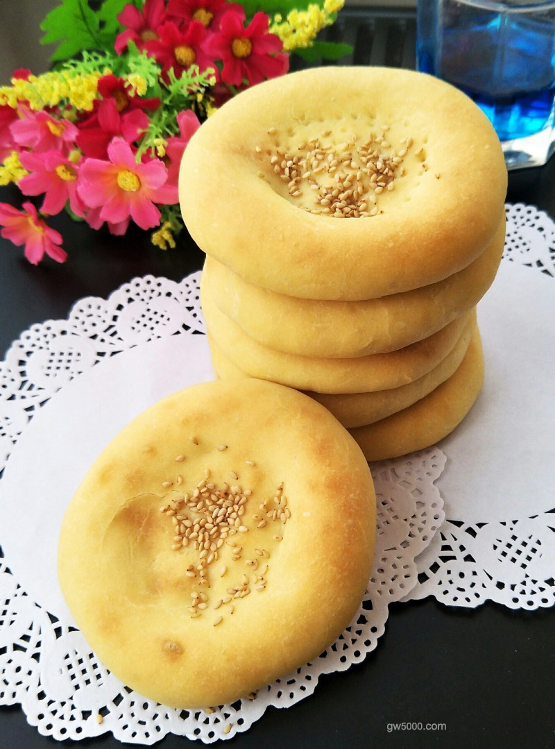 因为面很软为了防止变形,直接在铺有烤纸的烤盘上做成中间凹陷、四周鼓起的圆饼,用叉子在中间插眼,抹少许水撒上白芝麻,静置5分钟。