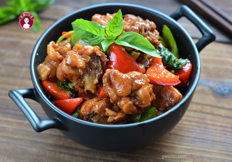 - 9汤汁浓香,鸡肉软烂入味,青红椒入锅翻拌变色。