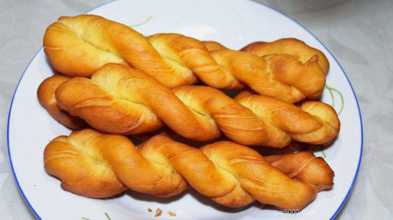 烤制 预热烤箱,指针调到290℃。烤制前,先浇油,每个麻花都浇上油,一盘麻花一共浇八两左右的油。然后将麻花盘放入烤箱,把温度调到250-260℃,约7-8分钟麻花表面白里透红,烤至底部成黄色时即可出炉,出炉时戴厚手套,先倒净盘中油,再取出即可。 炸制前,油提前预热,待油温160℃左右就可以炸制了。把麻花拿起轻轻地拉一下,拉长一点再进油锅里,炸制过程中要不停地翻动,这样炸制的更均匀,大约两分钟,表面呈金黄色就可以出锅了。