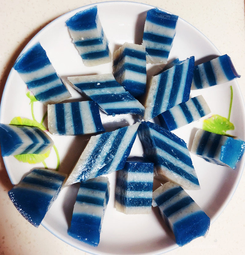 一碗250ml牛奶加入白糖加热后拌入马蹄粉备用,因为没有买到椰浆所以想着用牛奶上色了,另一碗有颜色的水放入微波炉加热后也加入适量马碲粉调成糊状,我没有去称比例,完全靠感觉了。