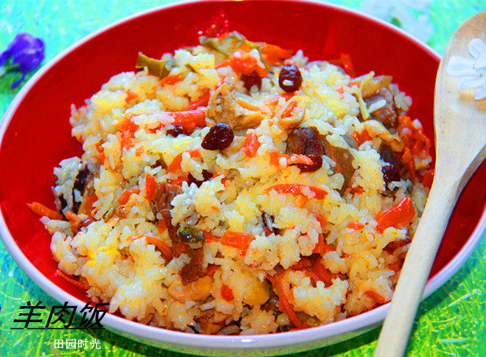 加1茶匙盐和孜然粉(自选)调味后,把泡过的大米和葡萄干铺在面上。
