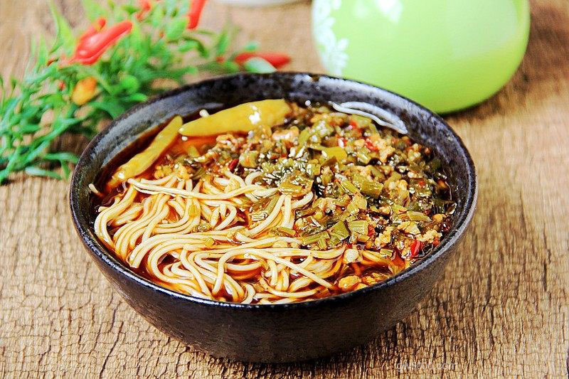 另起锅,将面条煮熟,盛入较大的碗中,浇入酸菜浇头即可