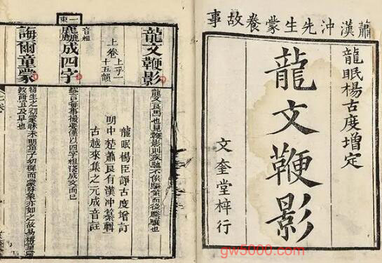 《龙文鞭影》原名《蒙养故事》,是中国古代非常有名的儿童启蒙读物,最初由明人萧良有编撰,后来杨臣诤进行了增补修订。龙文是古代一种千里马的名称,它只要看见鞭子的影子就会奔跑驰骋。作者的寓意是,看了这本《龙文鞭影》,青少年就有可能成为“千里马”。《龙文鞭影》主要是介绍中国历史上的人物典故和逸事传说,四字一句,两句押韵,读起来抑扬顿挫,琅琅上口。它问世后,影响极大,成为最受欢迎的童蒙读物之一。