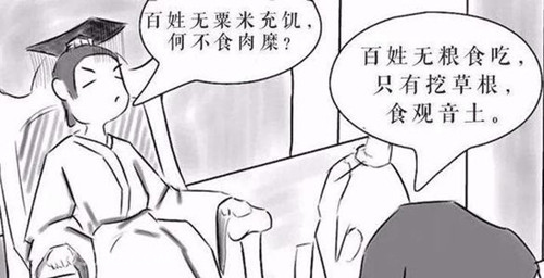又有一年闹灾荒,老百姓没饭吃,到处都有饿死的人。有人把情况报告给司马衷,但司马衷却对报告人说:“没有饭吃,他们为什么不吃肉粥呢?”报告的人听了,哭笑不得,灾民们连饭都吃不上,哪里来肉粥呢?由此可见司马衷是如何的愚蠢糊涂。