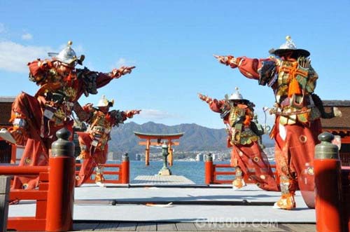 日本《兰陵王入阵曲》也称陵王、高陵王、罗陵王等,在日本它是一个非常重要的表演,并被视为日本国粹“能剧”的祖始。《兰陵王入阵曲》为一人独舞,表演时手持短棒的“兰陵王”头戴怪兽面具,身穿刺绣红袍,腰系透雕金带,在类似于中国古典乐器的齐鼓、羯鼓、钲、筚篥、笙的伴奏下缓缓移步,整个舞乐显得苍凉、缓慢和沉幽,没有展现战场上的紧张和激越的节奏。