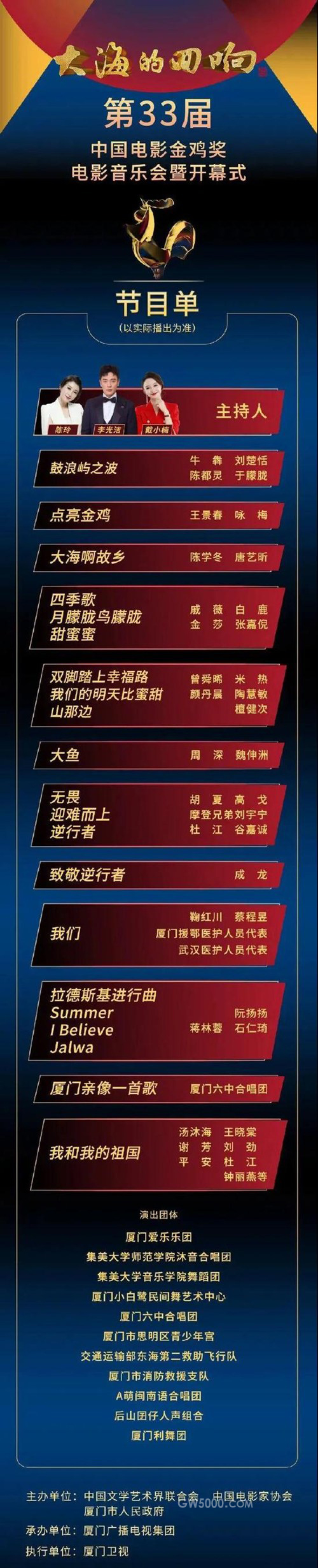 11月25日晚,大海的回响——第33届中国电影金鸡奖电影音乐会暨开幕式将在厦门白鹭洲下沉式广场举行。音乐会将以经典电影音乐、知名电影人讲述等为创作题材,并与启动仪式“点亮金鸡”相融合,力争呈现一台高水准、有特色的视听盛宴。