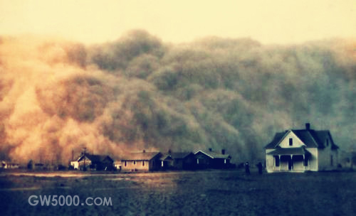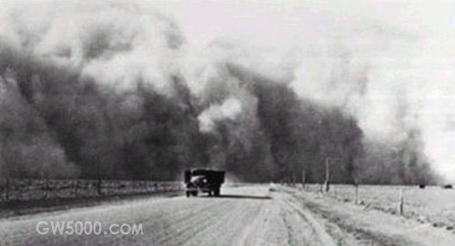 1934年5月12日,一场巨大的风暴席卷了美国东部与加拿大西部(部分地区)的辽阔土地。风暴从美国西部土地破坏最严重的干旱地区刮起,狂风卷着黄色的尘土,遮天蔽日,向东部横扫过去,形成一个东西长2400公里,南北宽1500公里,高3.2公里的巨大的移动尘土带,当时空气中含沙量达40吨/立方千米。
