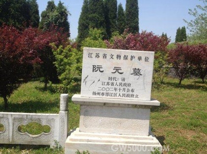 阮元墓系祖茔,位于邗江区槐泗镇永胜村。阮元祖茔始建于明朝天启年间,距今已有370多年。墓葬在永胜村北的老坝山,当地人称阮家大山。墓冢前,见一块约两米宽的墓碑横嵌在墓冢的中间,碑面异常光洁完整,上首第一行书:“皇清诏授光禄大夫太傅体仁阁大学士阮元文达公墓表。”阮元墓,封土高2.2米,周长24米,系清咸丰元年(1851)立石刻墓表,墓表由兵部侍郎杨文定撰,记载了阮元生平事迹及儿孙简况。
