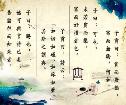 子贡说:“贫穷而能不谄媚,富有而能不骄傲自大,怎么样?”孔子说:“这也算可以了。但是还不如虽贫穷却乐于道,虽富裕而又好礼之人。”