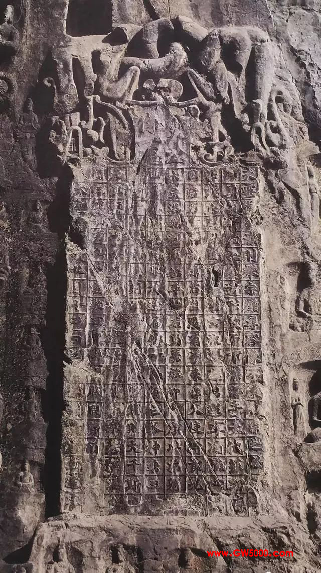 龙门二十品之比丘惠成造像记——造像龛位于古阳洞败笔第二层最外侧,是比丘惠成为亡父始平公造像龛。龛高240厘米,宽185厘米,深46厘米。圆券尖楣龛形,拱楣内侧刻十一童子牵花绳,二童子间凸刻莲花,浅浮雕茎叶。拱系雕刻时另刻装补,现已无存。造像龛两侧的龛柱,由忍冬纹,两个翘首的龙头及两个足踏地鬼的四臂天王代替。
