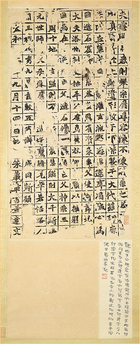 《龙门二十品》是龙门石窟中的二十尊造像的题记拓本,北魏书风的代表作。《始平公造像记》本是附属於佛龛的题记,全称为《比丘慧成为亡父始平公造像题记》,北魏孝文帝太和二十二年(498),刻於河南洛阳龙门古阳洞北壁。题记由孟达撰文,朱义章楷书。此碑与其它诸碑不同之处是全碑用阳刻法,逐字界格,为历代石刻所仅见,在造像记中独树一帜。记文内容寄造像者宗教情怀,兼为往生者求福除灾。清乾隆年间始被黄易(1744-1801)发现,受到书坛重视,列入“龙门二十品”,此碑文方笔斩截,笔画折处重顿方勒,结体扁方紧密,点划厚重饱满,锋芒毕露,显得雄峻非凡,被推为魏碑方笔刚健风格的代表。