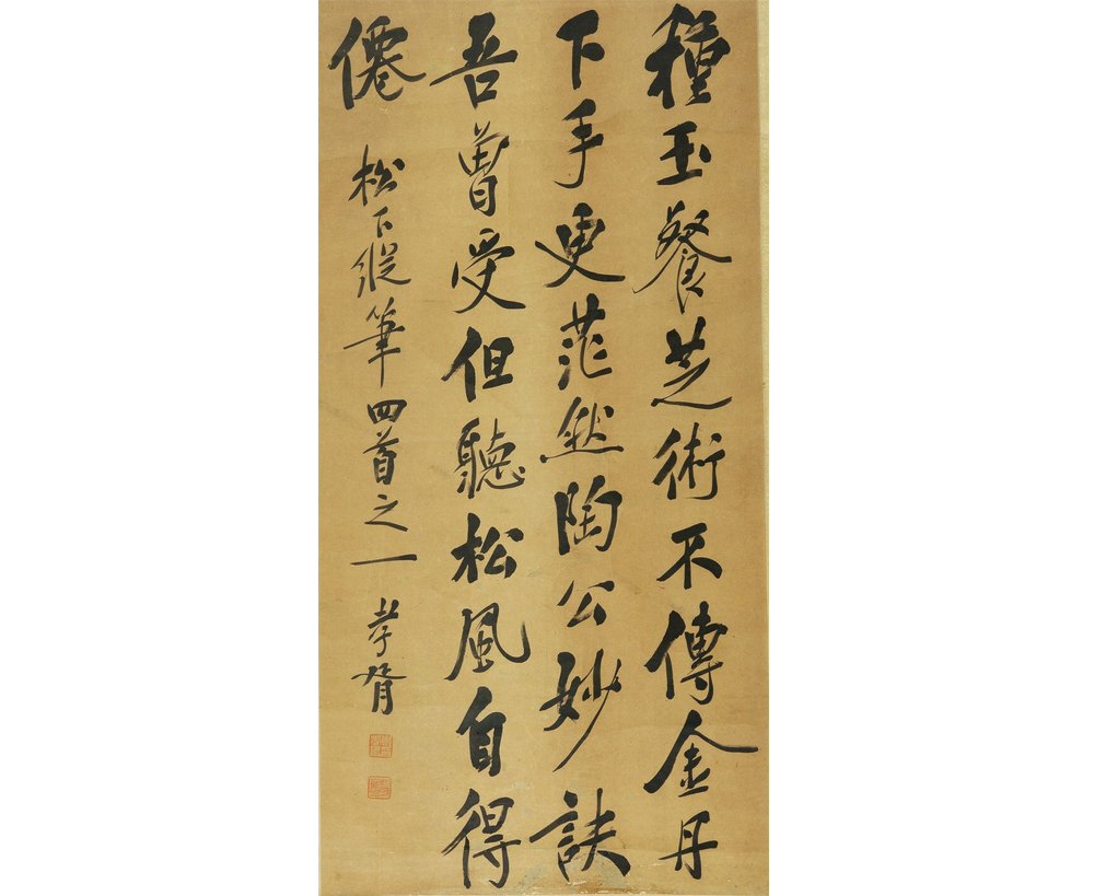 此轴行书伸展舒放,端严中露出奇肆的意韵。运笔自然,于轻捷中见稳健,灵动中透出潇洒。行笔流畅,线条粗细变化多姿。结字狭长,横肩外耸,折脚内收。横画左轻右重。竖画有内收之势。署款“孝胥”。钤“郑孝胥”白文印及“苏盫”朱文印。1959年陈嘉庚先生征集,现收藏于华侨博物院。