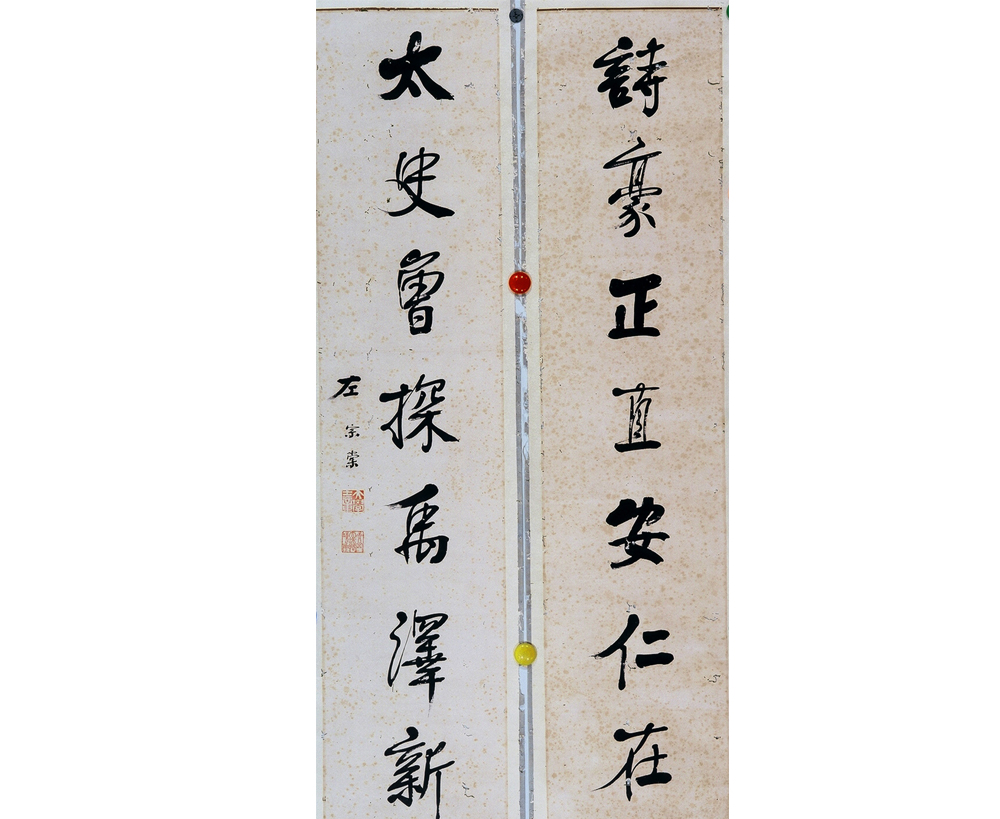 此行书对联书法清朗,运笔遒劲,笔力雄强,风格豪迈,沉着激迈,直追汉魏。署款“左宗棠”。钤“大学士”白文印及“清宫太保恪靖侯”朱文印。1959年陈嘉庚先生征集,现收藏于华侨博物院。