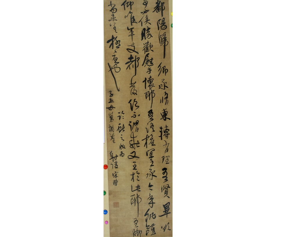 此轴草书笔笔着力,字字异形,行行殊致,极其自然。笔力苍劲,气势融贯,跌宕起伏,如行云流水,一泻千里之势。题识“于献之帖为子上母舅朗鉴”,署款“射陵宋曹”。钤“射陵宋曹”朱文印,“中书之章”白文印。1959年陈嘉庚先生征集,现收藏于华侨博物院。