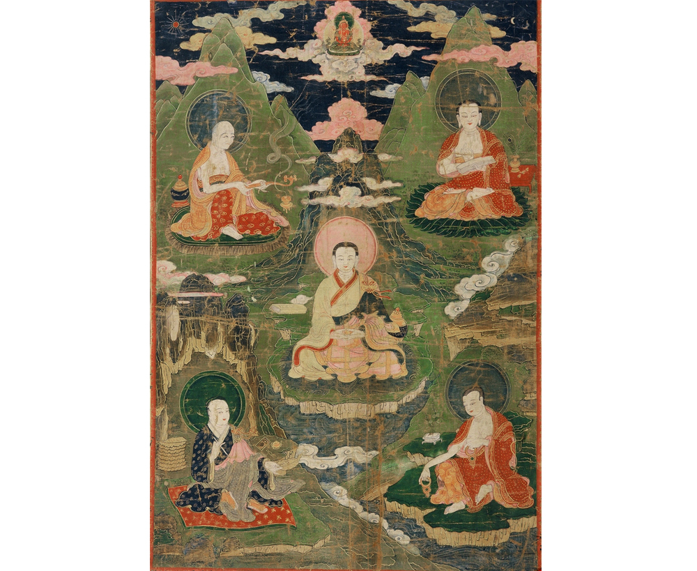 无款。图中用工笔重彩描绘五位罗汉,绿色或淡红色头光,法相宁静安祥,穿通肩柔软袈裟,盘膝端坐,有的手托佛经;有的手持香炉;有的手拿法器;有的右手执笔,左手持贝叶;有的双手结祥定印。身后绿色山峰,祥云缭绕。图上方正中为无量寿佛。