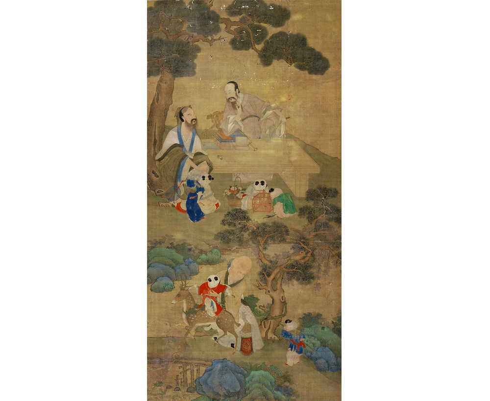 无款。此幅图为民间传说的福、禄、寿三神聚会情景。古松树下,温文尔雅福星手执如意与右边禄星谈经论道,石桌上摆放书籍、手卷。前有三婴儿正忙着玩蝈蝈。小桥上广额白须的寿星抱着穿红衣婴儿骑上梅花麋鹿,另一婴儿手持鸠杖紧随其后。呈现一片轻松自然、恬静祥和的情景。全幅构图严谨饱满,人物情态生动传神,衣褶勾线圆润秀劲,纤细流畅,树木山石勾勒工致,色彩浓艳。坡石大青大绿,与人物朱衣红裳相互争辉。1959年陈嘉庚先生征集,现收藏于华侨博物院。