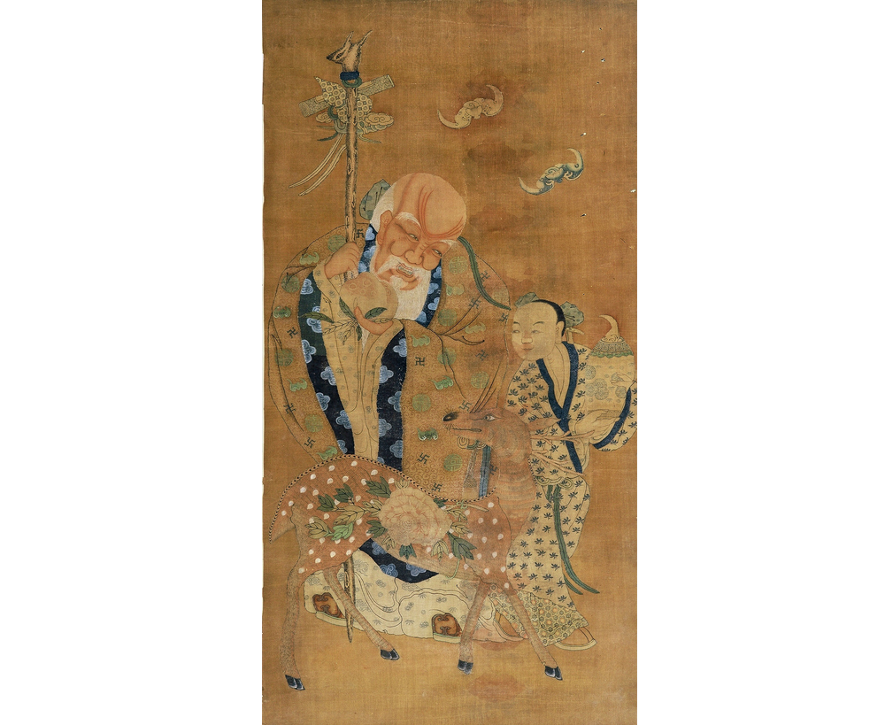 无款。此轴用彩色丝线缂织成一幅祝寿画。图中一位银须白发,身穿蝙蝠、寿、卐图案宽袖长袍的寿星,左手捧仙桃,右手柱龙头拐杖,杖上挂有葫芦、灵芝、经卷。年青美貌的麻姑手抱酒瓶随其身边。麋鹿身负牡丹立在身前。空中飞舞着两只蝙蝠,寓意福、禄、寿三全,平安富贵,子孙万代。用色娇艳,气氛祥瑞,但不俗气。用缂丝多种技法及细部工笔精描的缂绘形式,完美和諧表现了图画的精美。1959年陈嘉庚先生征集,现收藏于华侨博物院。