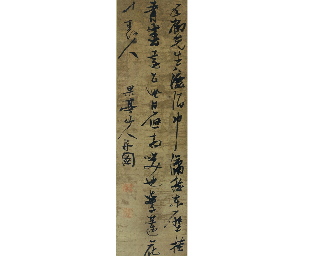 此轴书法以露锋起笔,笔画伸展,夸张倾斜度很大。转折尖锐,使结体多呈锋利、劲挺气势,在章法上字距紧密,行距宽松。整个作品笔调奇险,节奏明快,气魄宏大。署款果亭山人瑞图。钤“瑞图”朱文印,“书画禅”白文印。1959年陈嘉庚先生征集,现收藏于华侨博物院。