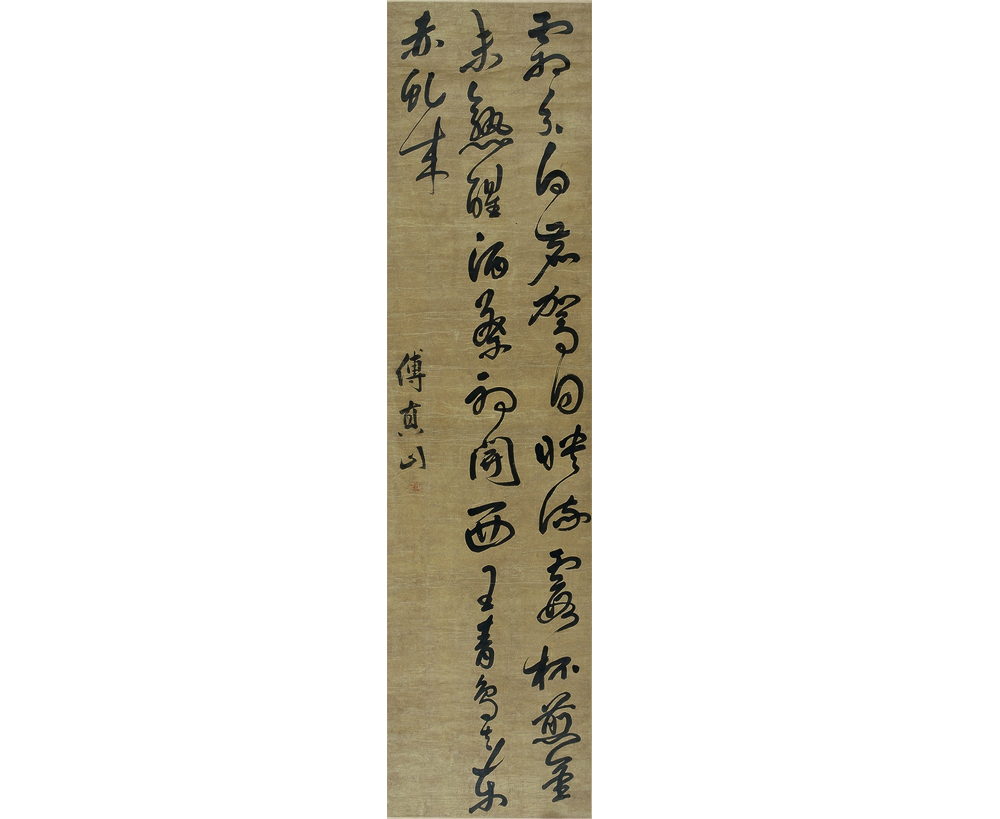 此轴书法起伏跌宕,字势屈曲盘绕。字与字间揖让纵敛连带自然,用笔健劲,流畅奔放,通篇奔龙飞蛇。暑款傅真山,钤“傅山印”白文印。1959年陈嘉庚先生征集,现收藏于华侨博物院。