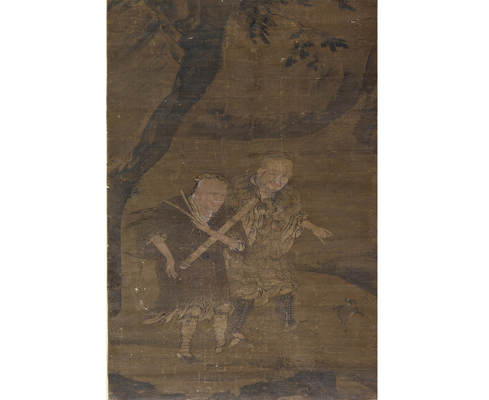 无款。此图描绘二仙人葛巾野服,衣衫褴褛,银须白发,慈眉目善,笑容可掬。一个拍打鱼鼓,一个手举葫芦,在深山溪水边,戏钓三足金蟾。动态生动呼应密切。人物工笔勾勒填彩,衣纹流畅自如,精细工致。设色明快淡雅,个性鲜明。树石用笔粗放刚劲。1959年陈嘉庚先生征集,现收藏于华侨博物院。