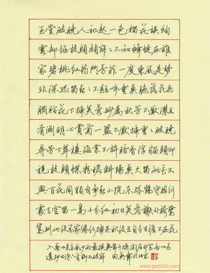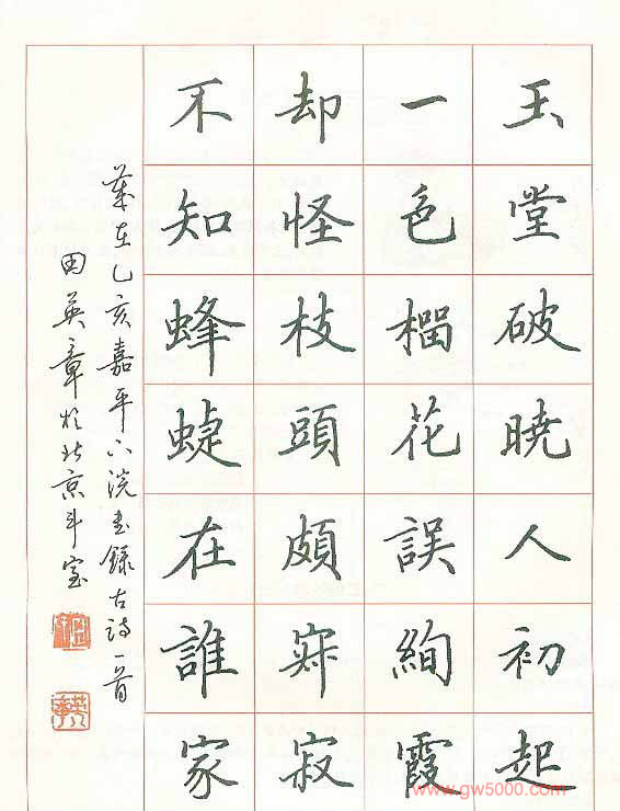 田英章,l950年生于天津,字存青、存卿,书法研究生,国家人事部干部。先后毕业于首都师范大学、日本东京学艺大学。l953年随父、伯、兄研习书法;l970—1980年在部队从事文艺;l977—1992年五次获得国内外书法展、赛一等奖;l981年加入中国书法家协会;198l—l990年特调国家人事局担任《国务院任命书》书写员;1991—1993年应日本邀请,在日本创写印刷字体楷书、行书两套,约五万余字;l996—2000年联络台湾、日本书法界友人创建北京长城碑林;1994—2000年主办过六次全国书画人才艺术交流大会;l983—l994年九次赴日本、香港、韩国、欧洲办展讲学和交流;1986—1996年主办国内国际大型书画展赛七次;自l985至今,曾在中央电视台、北京理工大学、中央民族学院、首都师范大学、林业大学、日本国艺书道院等单位教授硬笔书法、毛笔书法;l987—2002年出版书法字帖、教材、录象带、光盘七十余种。