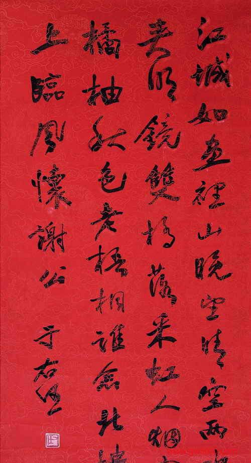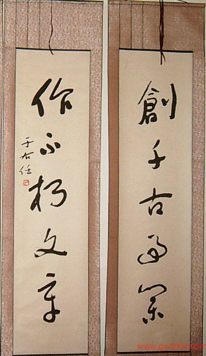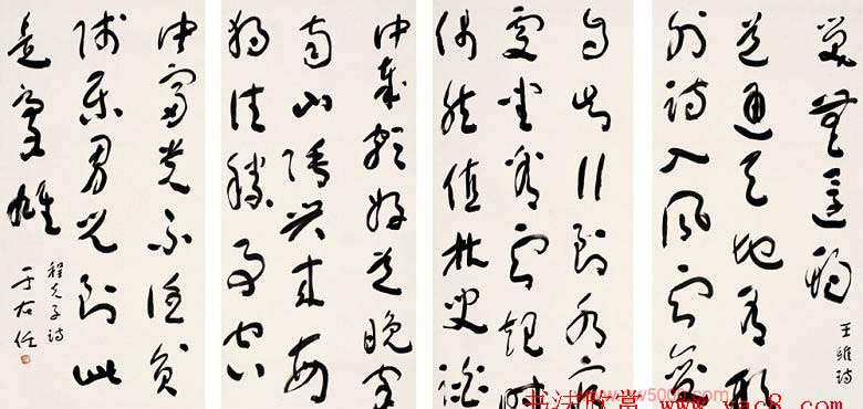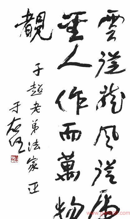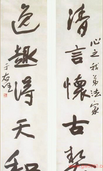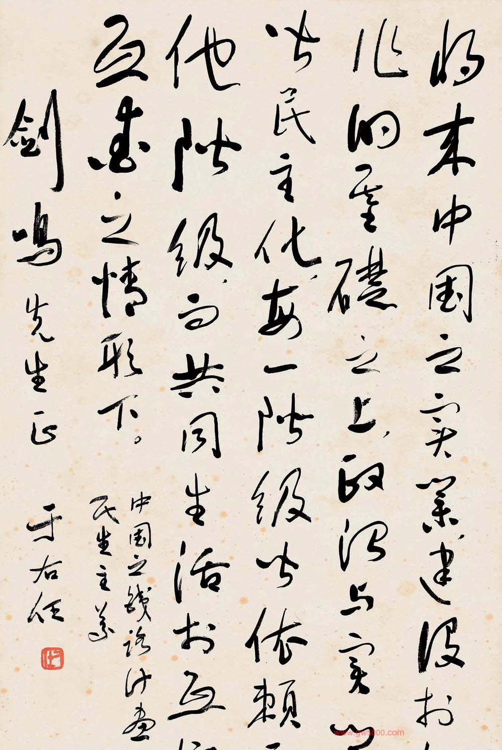 于右任的书法雄豪婉丽,冲淡清奇,于先生到了晚年,他的草书更进入到出神入化的境界,真是字字奇险,绝无雷同。在他的笔下,将草书熔章草、今草、狂草于一炉,时呈平稳拖长之形,时而作险绝之势,时而与主题紧相粘连,时而纵放宕出而回环呼应,雄浑奇伟、潇洒脱俗、简洁质朴,给人以仪态万千之感。他将推广标准草书“易识、易写、准确、美丽”的原则用于实践,作到笔笔随意,字字有别,大小斜正,恰到好处。结体重心低下,用笔含蓄储势,出神入化。他在书法上成为一代宗师,日本朋友称他为“旷代草圣”。