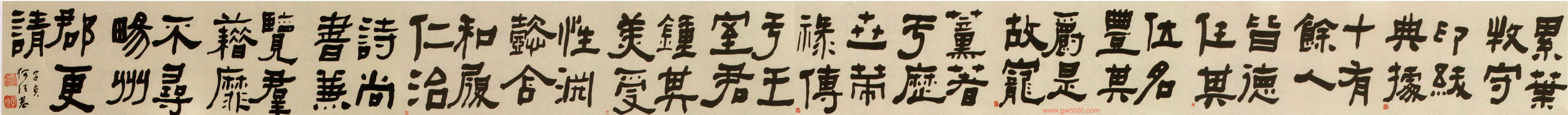 清代何绍基隶书书法长卷欣赏《隶书卷》,横309.5cm 纵25.1cm,辽宁省博物馆藏。