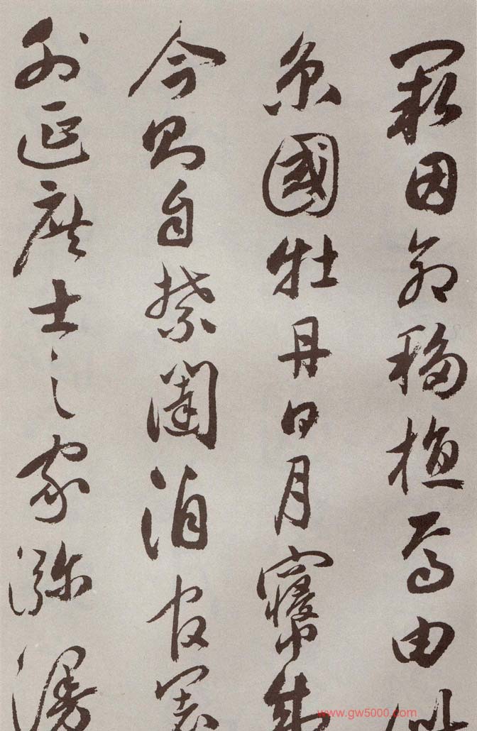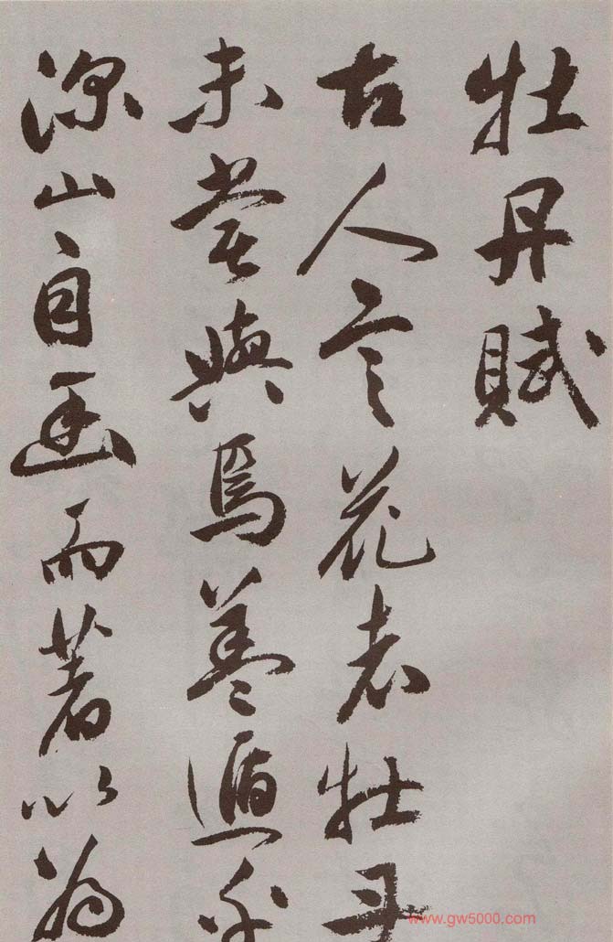 祝允明行草书法《牡丹赋》有自题云:“甲申岁春三月望日,过汤氏西园观牡丹盛开,廷用酒次出纸索书舒元舆牡丹赋,遂书以归之。允明”,并钤“晞哲”、“包山真意”二印。可知该卷是应友人所请,书唐舒元舆所撰文学名篇《牡丹赋》,时在嘉靖甲申(一五二四年)三月十五日,祝氏六十五岁。此卷由故宫博物院收藏,纵30.6厘米,横529.6厘米。钤有“昌伯所得”藏印一方。