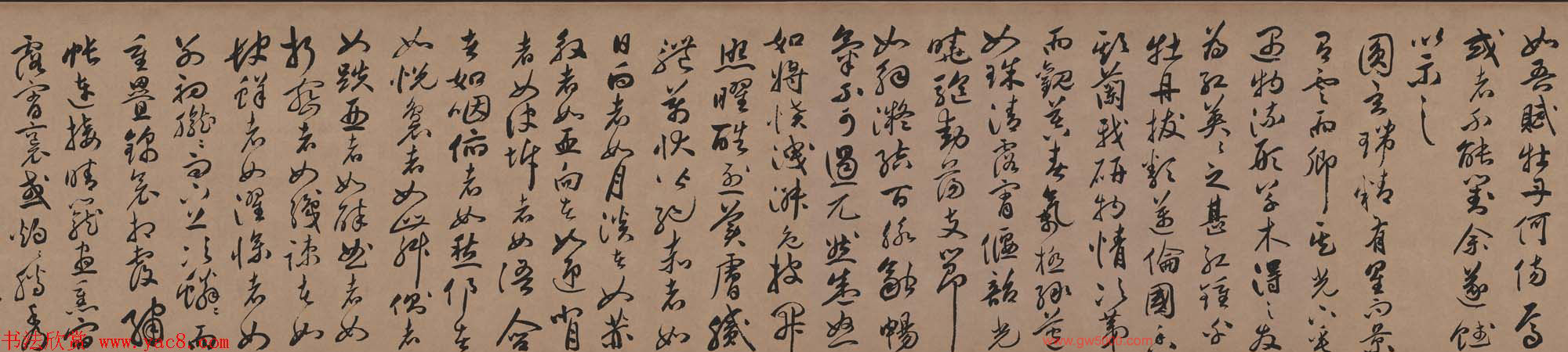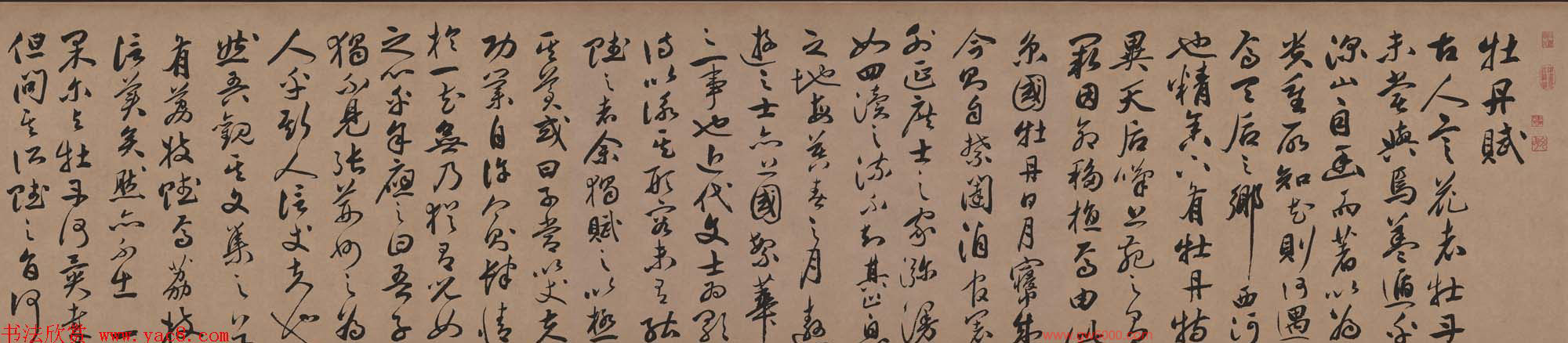 祝允明行草书法长卷欣赏《牡丹赋》纵30.6厘米,横529.6厘米。钤有“昌伯所得”藏印一方。 故宫博物院收藏。