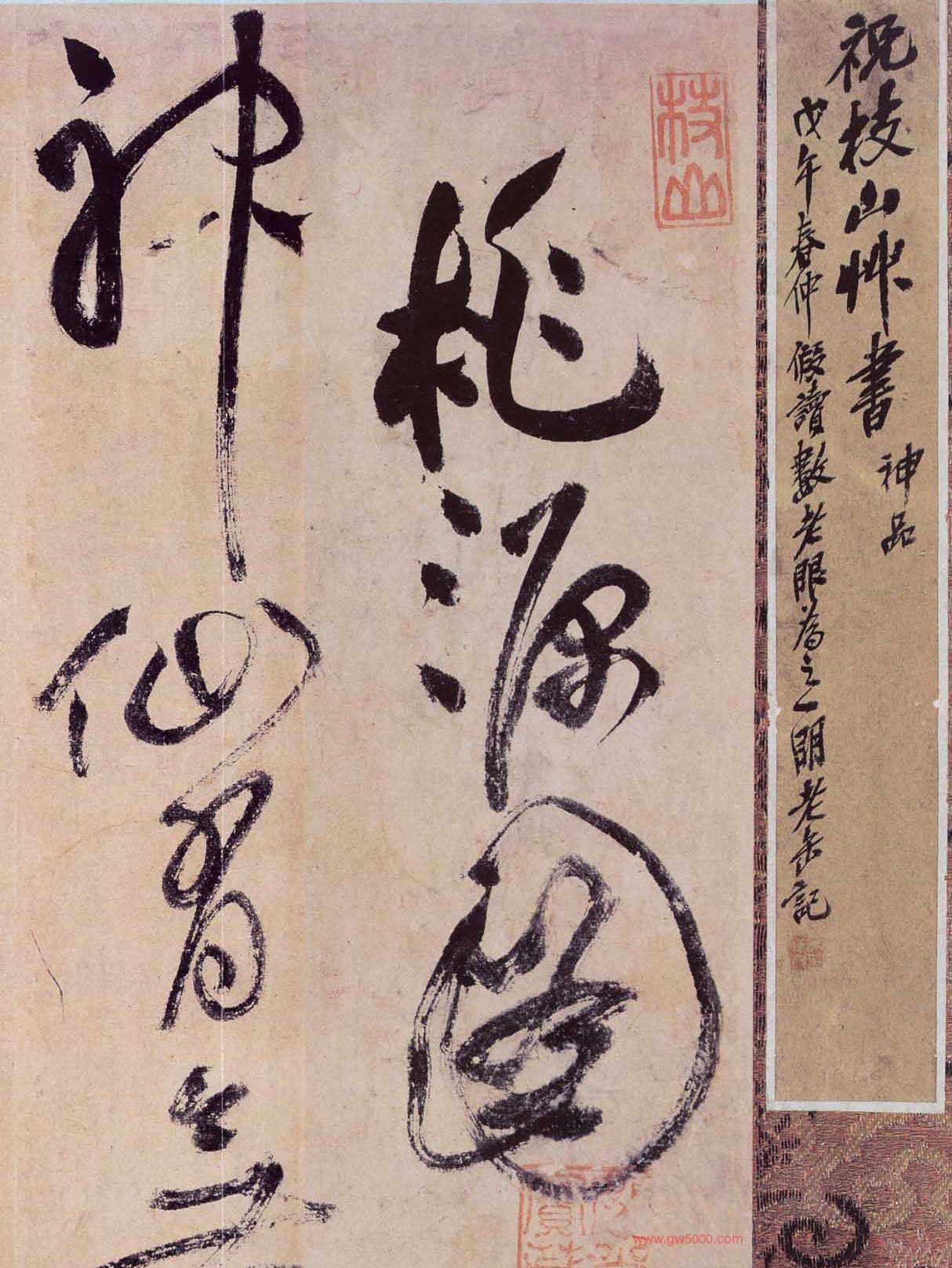 释文:神仙有無何渺茫,桃源之說誠荒唐。流水盤迴山百轉,生綃數幅垂中堂。 武陵太守好事者,題封遠寄南宮下。南宮先生忻得之,波濤入筆驅文辭。 文工畫妙各臻極,異境恍惚移於斯。架巖鑿谷開宮室,接屋連牆千萬日。 嬴顛劉蹶了不聞,地坼天分非所恤。種桃處處惟開花,川原近遠蒸紅霞。 初來猶自念鄉邑,歲久此地還成家。漁舟之子來何所,物色相猜更問語。 大蛇中斷喪前王,群馬南渡開新主。聽終辭絕共悽然,自說經今六百年。 當時萬事皆眼見,不知幾許猶流傳。爭持酒食來相饋,禮數不同樽俎異。 月明伴宿玉堂空,骨冷魂清無夢寐。夜半金雞啁哳鳴,火輪飛出客心驚。 人間有累不可住,依然離別難為情。船開櫂進一迴顧,萬里蒼蒼煙水暮。世俗寧知偽與真,至今傳者武陵人。 枝山祝允明書於種桃館中。