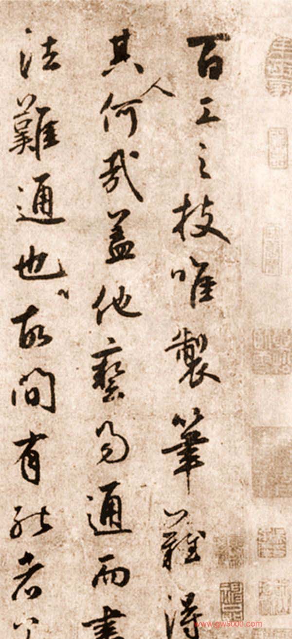 鲜于枢的书法成就,主要在于行草。草书学怀素并能自出新意。他的执笔方法很有特点,使用独特的回腕法;喜欢用狼毫,行草书骨力劲健,真力饱满。