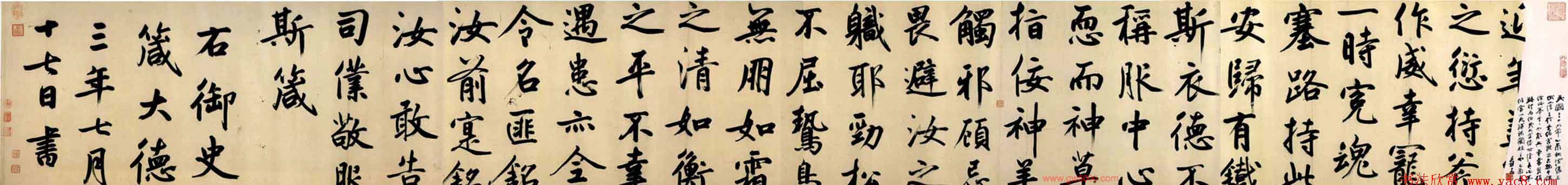 元代鲜于枢行楷书法长卷欣赏《御史箴卷》纸本,50.1x409.6厘米。大德三年(1299)作,普林斯顿大学美术馆藏。此卷运笔沉雄朴茂,不事雕琢,而风华自在。卷后有赵孟頫跋曰:“伯机书,笔笔皆有古法,足为至宝。”