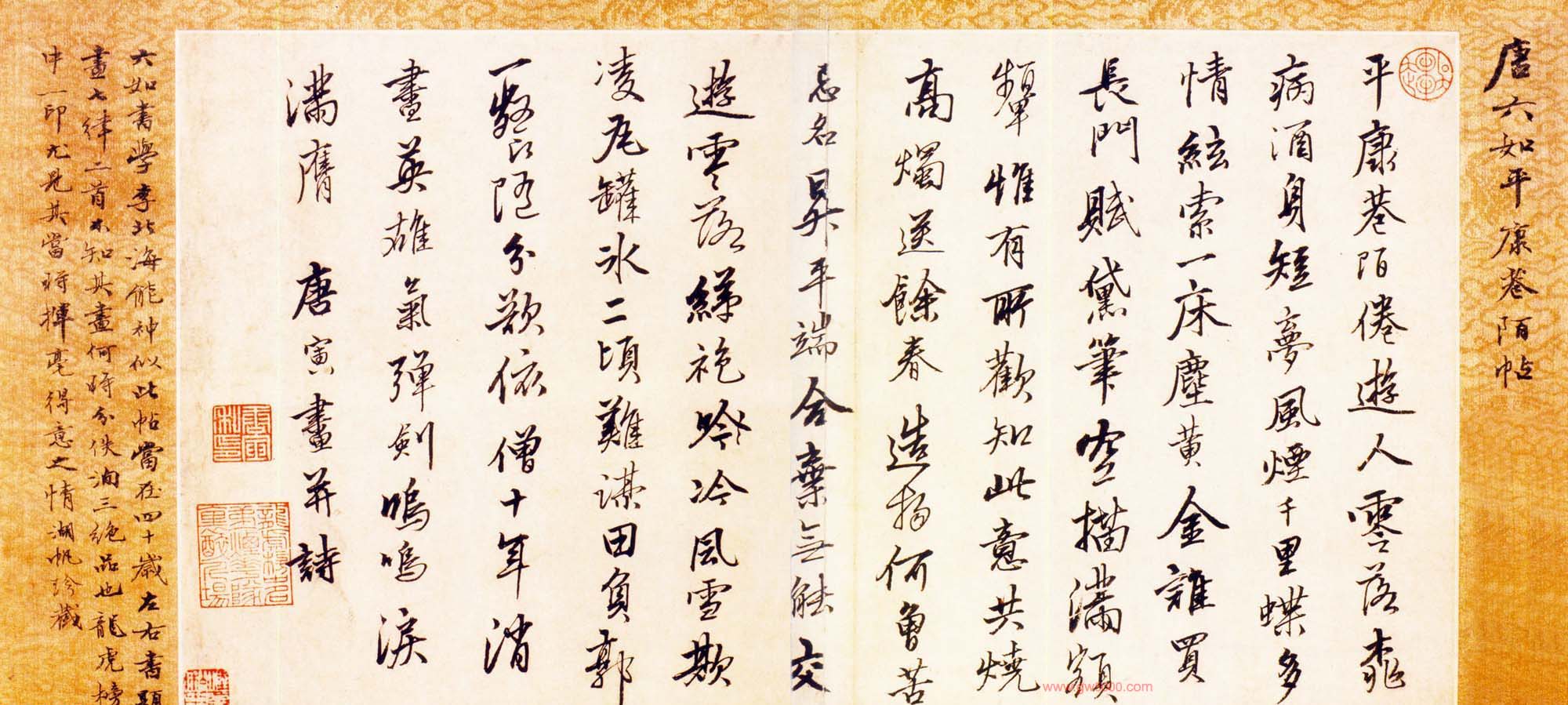 唐寅行书横幅欣赏《唐六如平康卷陌帖》纸本,22.9×45cm,吴湖帆题跋,上海博物馆藏。