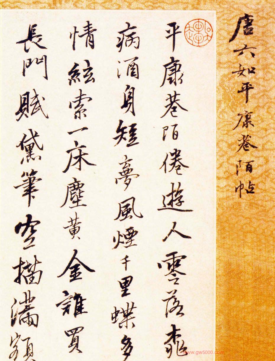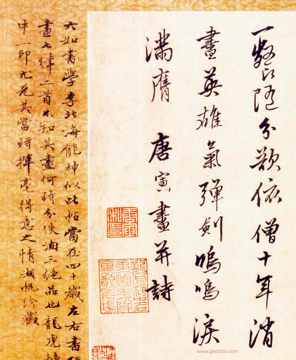 释文: 平康巷陌倦游人,零落桃(花)病酒身。短梦风烟千里蝶,多情弦索一床尘。黄金谁买《长门赋》,黛笔空描满额颦。惟有所欢知此意,共烧高烛送余春。造物何曾苦忌名,升平端合弃无能。交游零落绨袍冷,风雪欺凌瓦罐冰。二顷难谋田负郭,一餐随分欲依僧。十年消尽英雄气,弹剑呜鸣泪满膺。 唐寅画并诗。