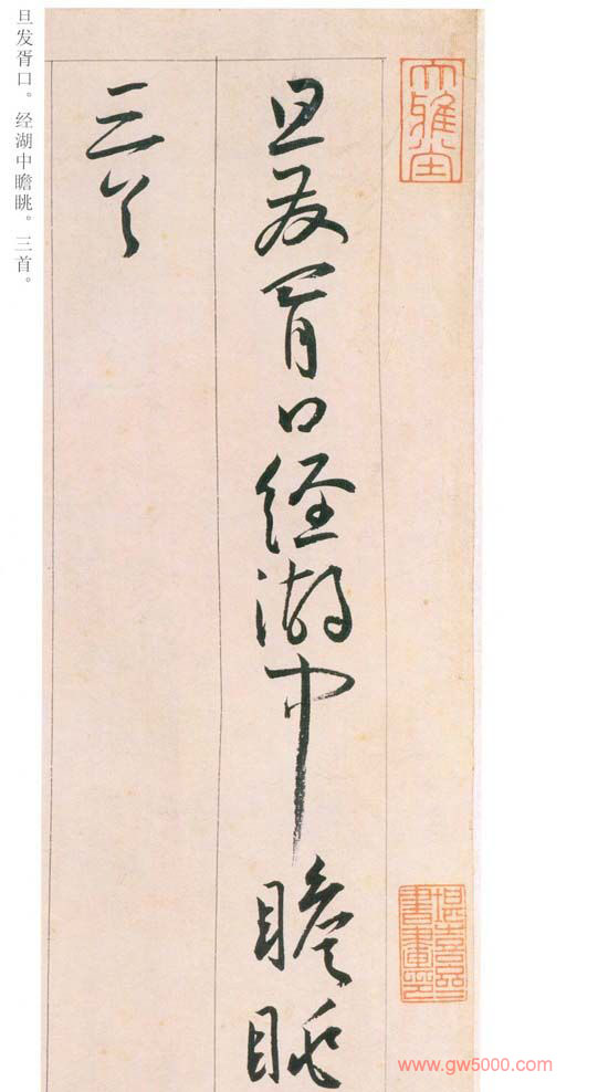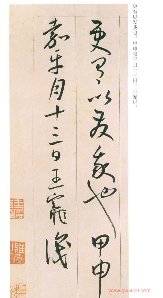 卷前钤有“且喜斋书画印”朱文长方印一枚。此书作于嘉靖三年甲申(1524年),时年王宠整三十岁。此时,他的书法尚处于兼采众长、变化融通的阶段,用笔尖锐果猛,线条圆润遒劲,字体大多欹侧且较后期书作为长。